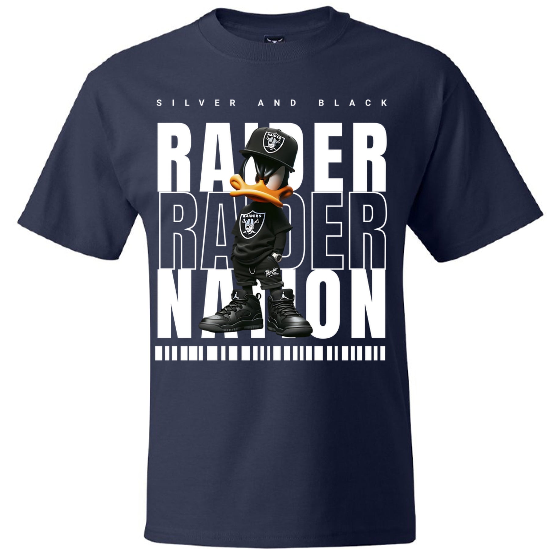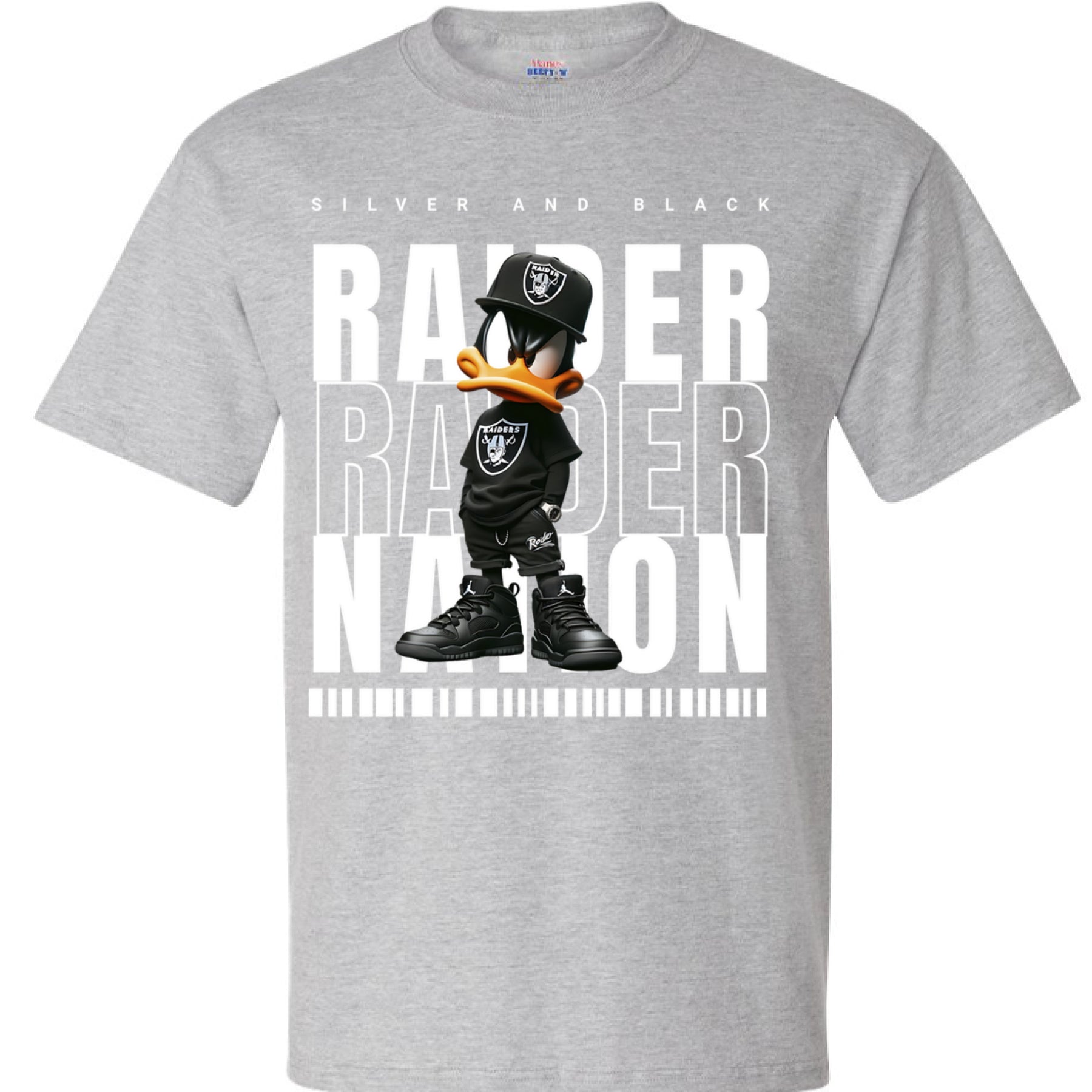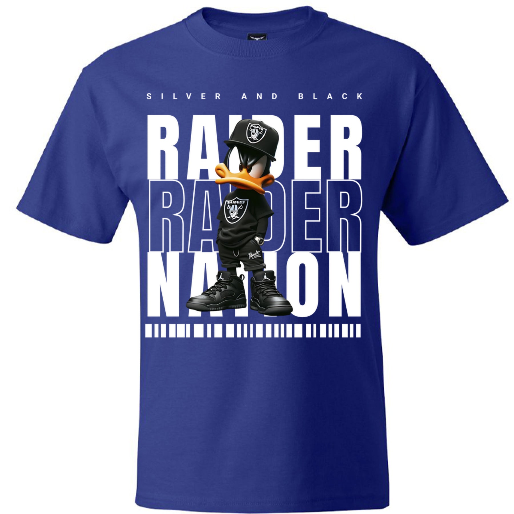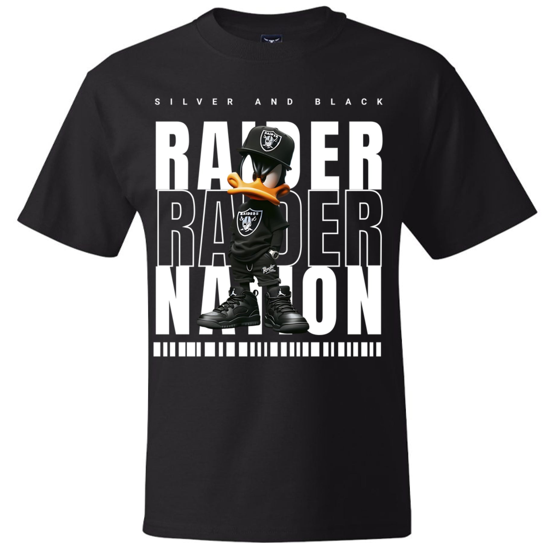 Stand proud with the Silver & Black in this bold Raider Nation tee! Featuring a tough cartoon Raider graphic over stacked “RAIDER NATION” lettering, this shirt is built for diehard fans. Soft cotton, athletic fit, and perfect for game day, tailgates, or everyday streetwear. Commitment runs deep.